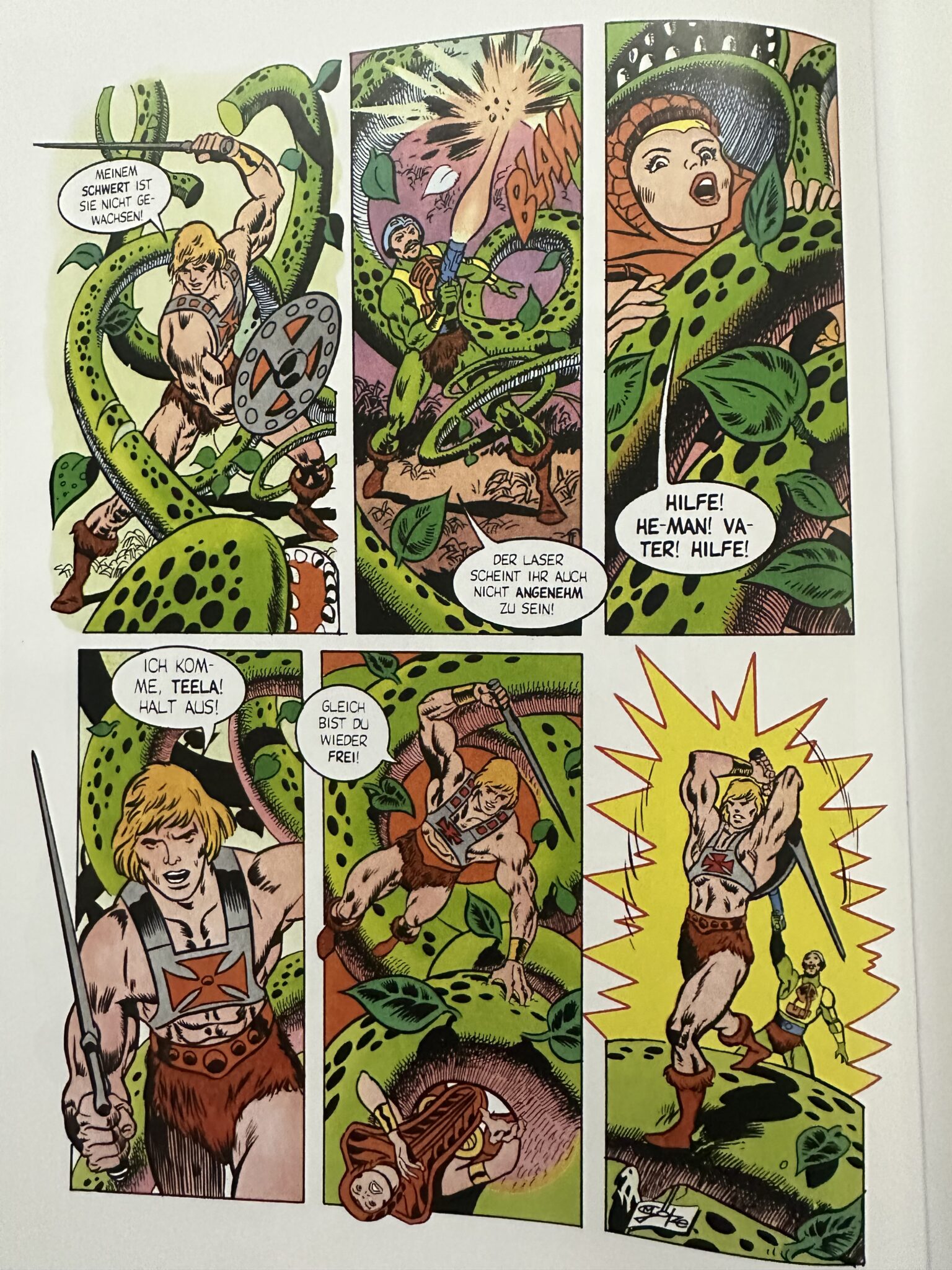 Hier waren dies die Geschichten Im Tal der Bestien aus dem Interpart-Comicmagazin Nr. 4 von 1985 und Hordaks teuflische Falle aus dem Ehapa-Comicband Nr. 3 vom 29.09.1987. Die beiden Auflagen des Interpart-Sammelbands sind bei uns leider nicht mehr erhältlich, aber möglicherweise sind Restbestände bei Händlern noch vereinzelt auf Lager. Einzelne Comic-Panels daraus wurden von Karsten Klintzsch für das Begleitmaterial im Mediabook der Deluxe Edition etwas überarbeitet.