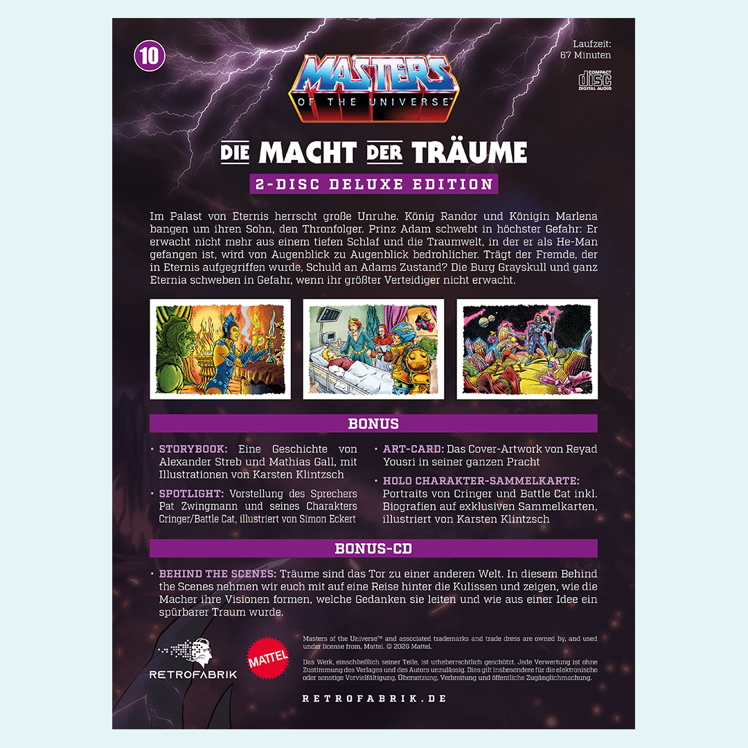 Taucht ein in eine Welt voller Abenteuer, Mysterien und unvergesslicher Charaktere mit unserer brandneuen Hörspielserie, die die zeitlosen Geschichten von He-Man, Skeletor und ihren Verbündeten und Feinden auf völlig neue Weise zum Leben erweckt. Professionelle Sprecher, ein Sounddesign das ein kinoreifes Erlebnis bietet, epische Musik und packende Geschichten werden euch in die Schlachten von Eternia versetzen. Von atemberaubenden Kämpfen bis hin zu bewegenden Charaktermomenten – jedes Kapitel unserer Hörspielserie wird euch in den Bann ziehen und euch das Gefühl geben, Teil dieser legendären Welt zu sein.