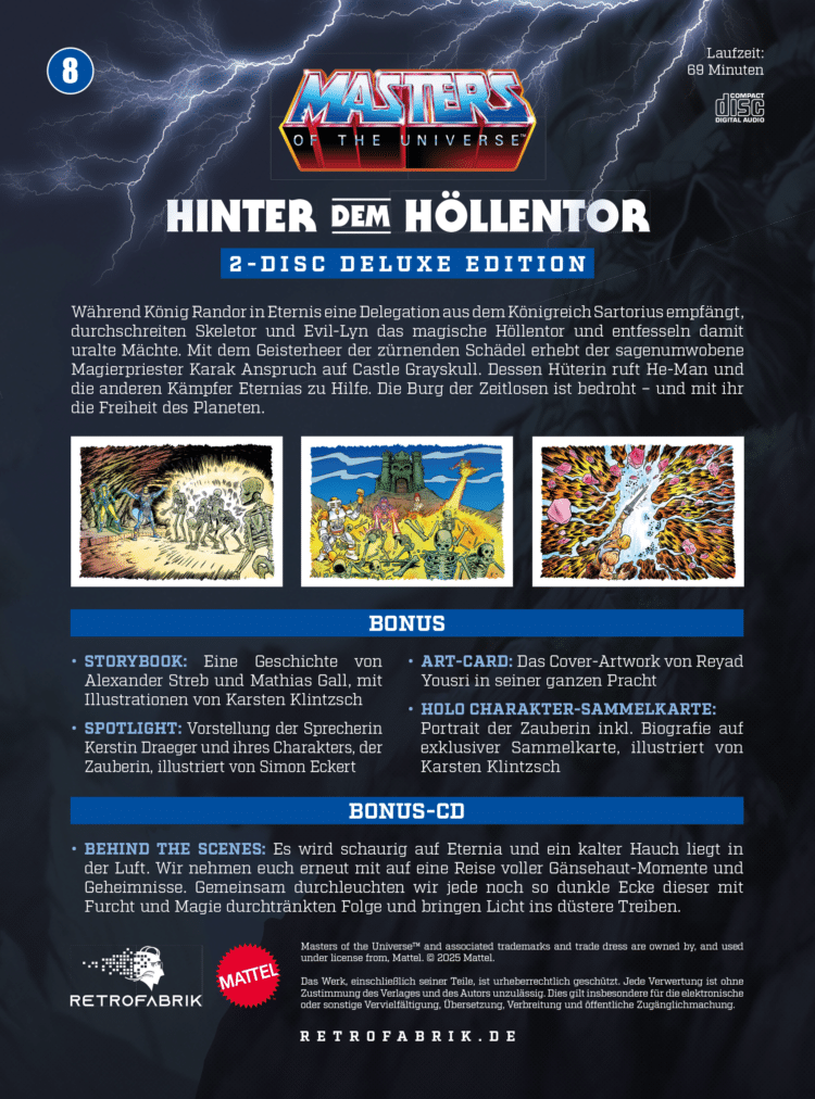 Taucht ein in eine Welt voller Abenteuer, Mysterien und unvergesslicher Charaktere mit unserer brandneuen Hörspielserie, die die zeitlosen Geschichten von He-Man, Skeletor und ihren Verbündeten und Feinden auf völlig neue Weise zum Leben erweckt. Professionelle Sprecher, ein Sounddesign das ein kinoreifes Erlebnis bietet, epische Musik und packende Geschichten werden euch in die Schlachten von Eternia versetzen. Von atemberaubenden Kämpfen bis hin zu bewegenden Charaktermomenten – jedes Kapitel unserer Hörspielserie wird euch in den Bann ziehen und euch das Gefühl geben, Teil dieser legendären Welt zu sein.